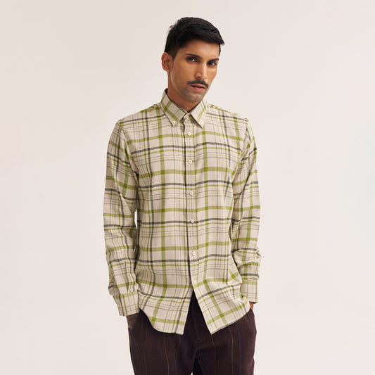 • Relaxed fit off white and green check handwoven cotton shirt front view