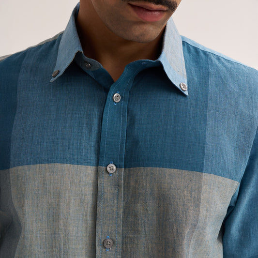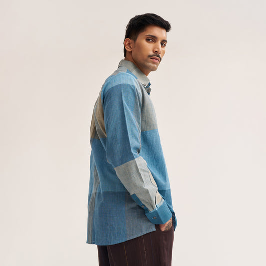 REGULAR FIT INDIGO COLOUR BLOCK HANDWOVEN COTTON SHIRT