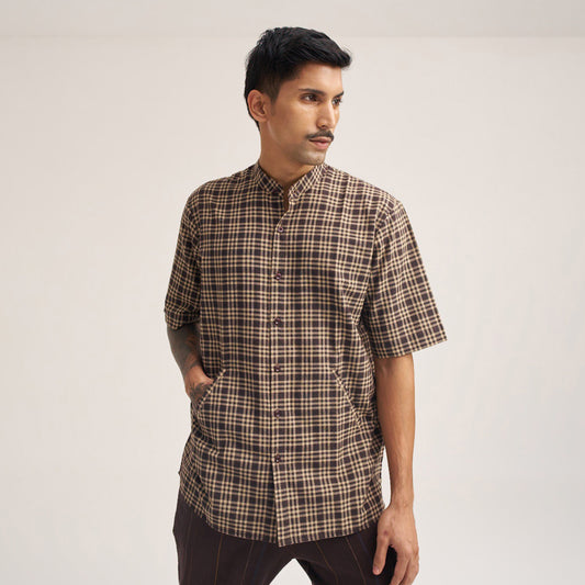 • Relaxed fit dark brown check handwoven cotton shirt front view