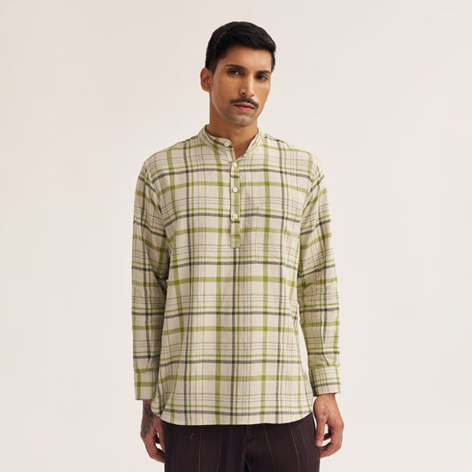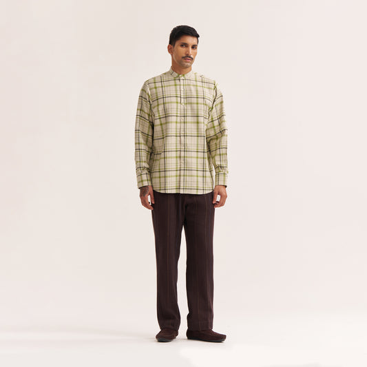 OFF WHITE AND GREEN CHECK BAND COLLAR HANDWOVEN COTTON SHIRT