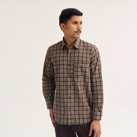 REGULAR FIT DARK BROWN CHECK COTTON SHIRT