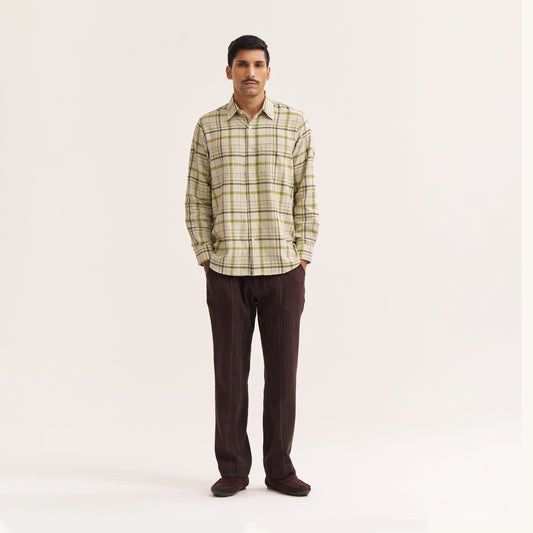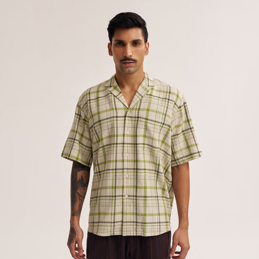 RELAXED FIT OFF WHITE AND GREEN CHECK HANDWOVEN COTTON SHIRT