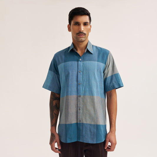 REGULAR FIT INDIGO COLOUR BLOCK HALF SLEEVE HANDWOVEN COTTON SHIRT