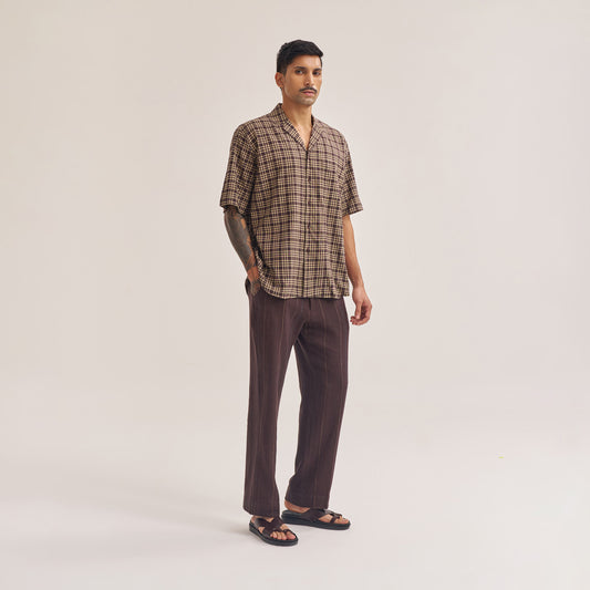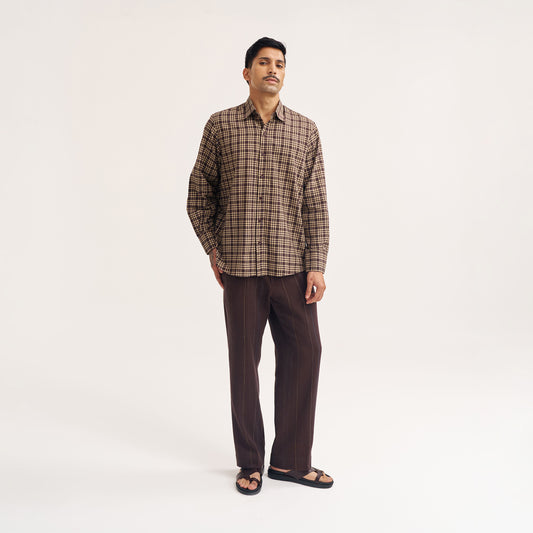 RELAXED FIT DARK BROWN CHECK HANDWOVEN COTTON SHIRT