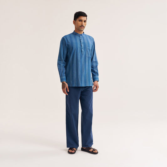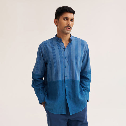 INDIGO STRIPE BAND COLLAR SHIRT WITH PATCH POCKET