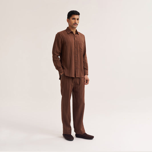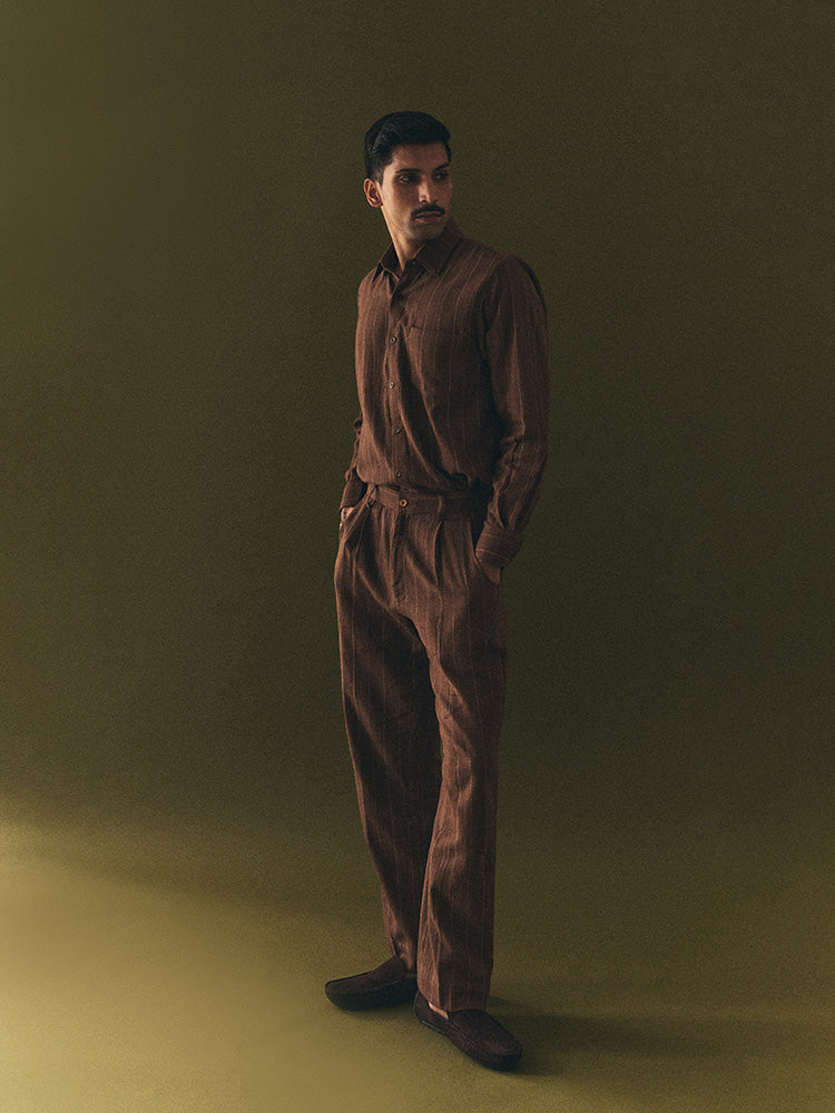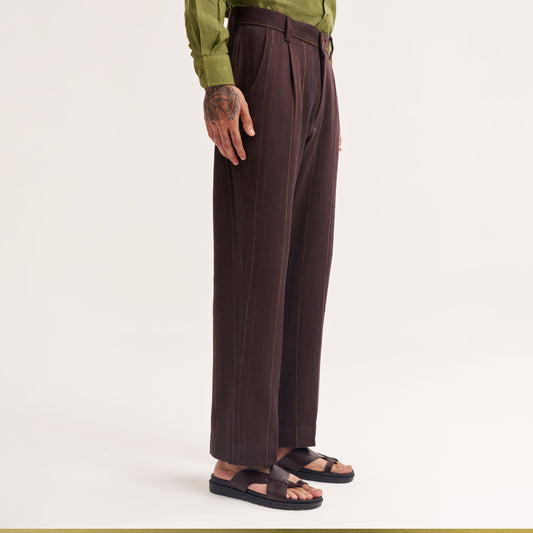 STRAIGHT-FIT DARK BROWN STRIPE HANDSPUN AND HANDWOVEN COTTON TROUSERS