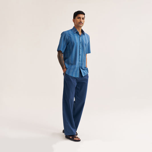 REGULAR FIT INDIGO STRIPE HALF SLEEVE HANDWOVEN COTTON SHIRT